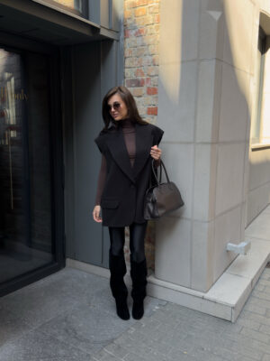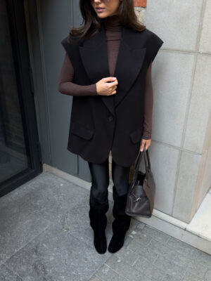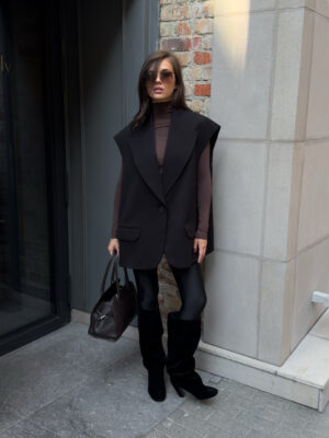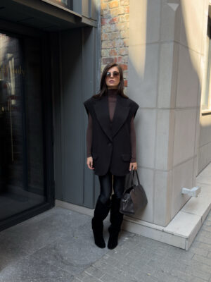 Об’ємний крій, чіткі лінії плечей, глибокі лацкани — цей жилет стає головним акцентом.