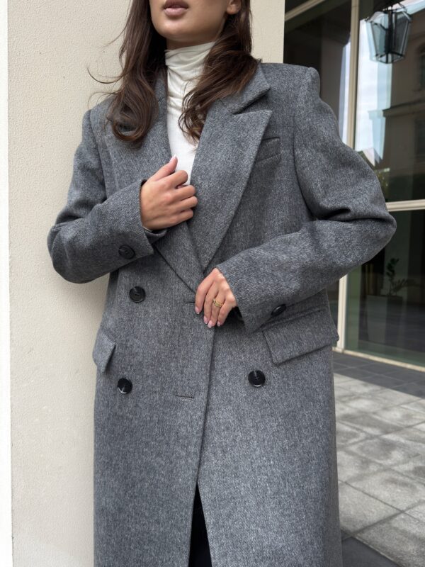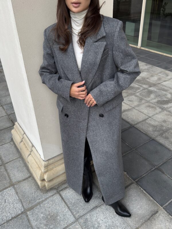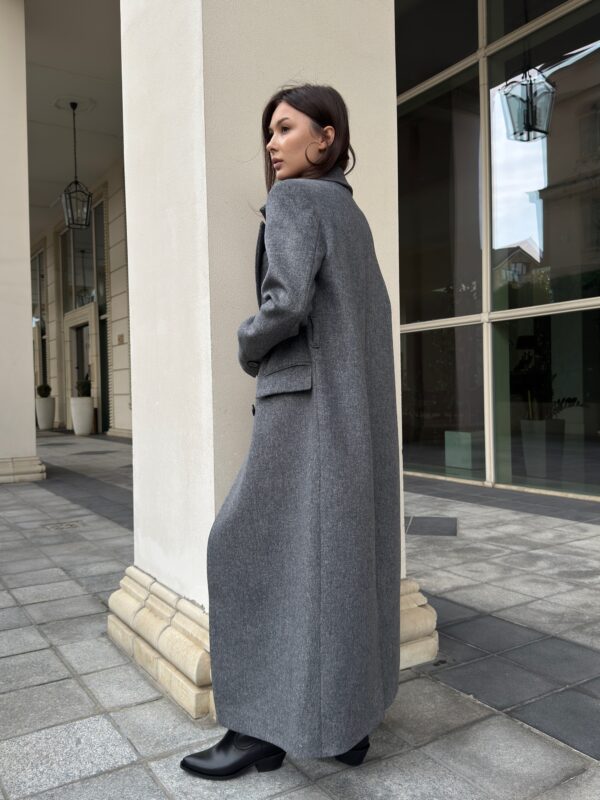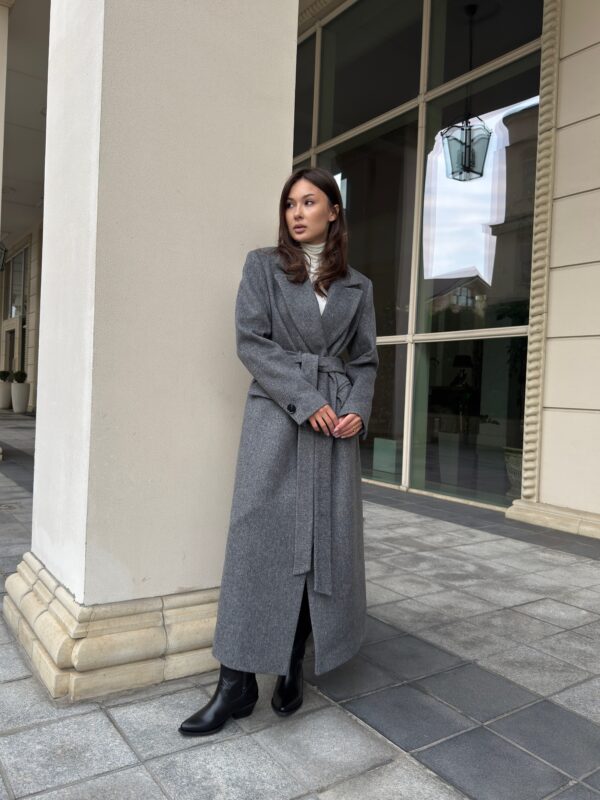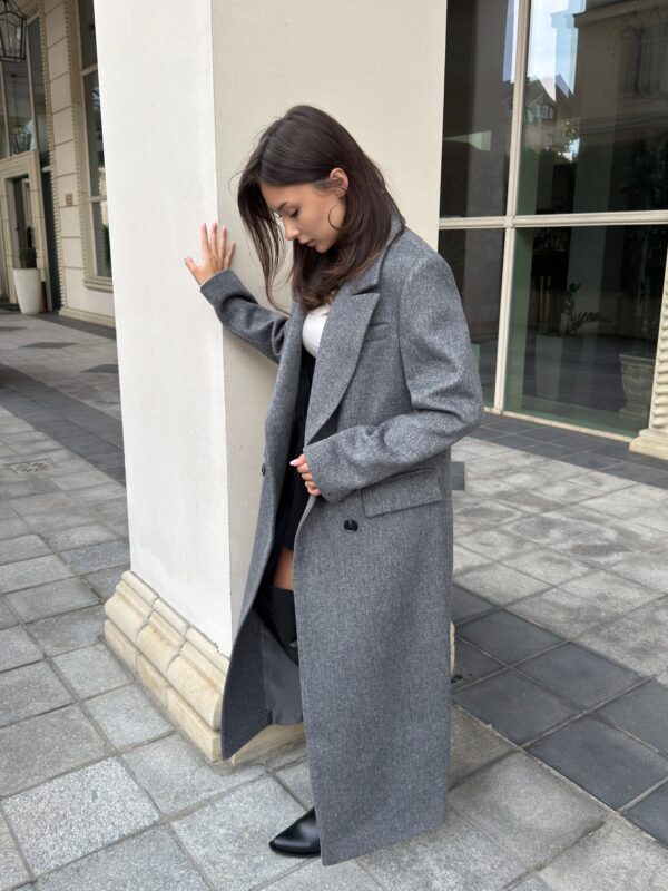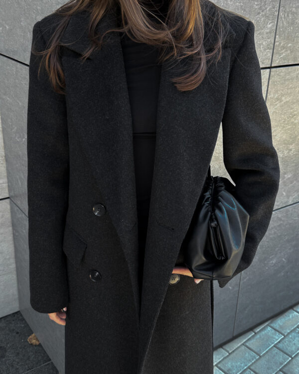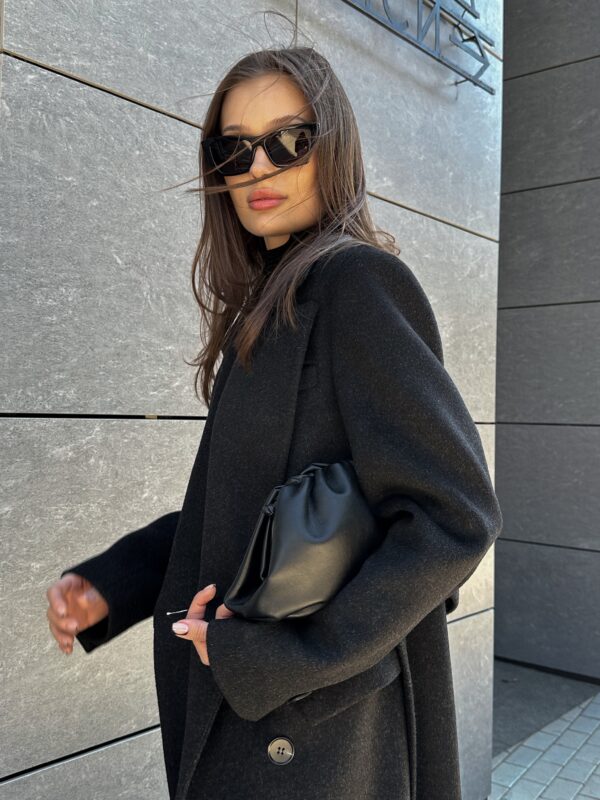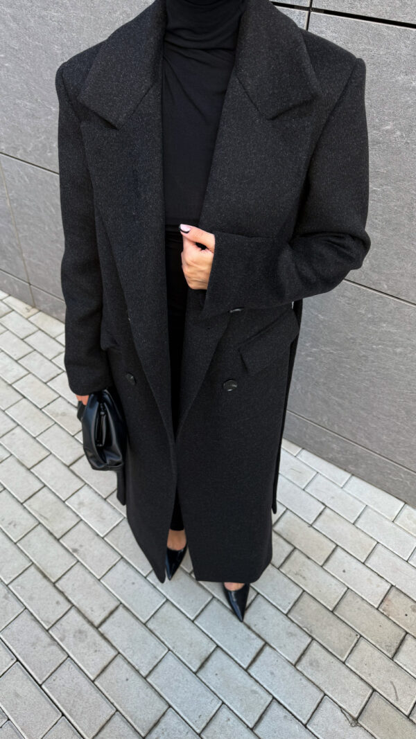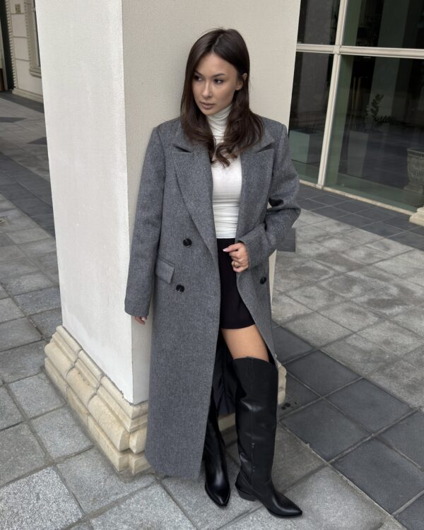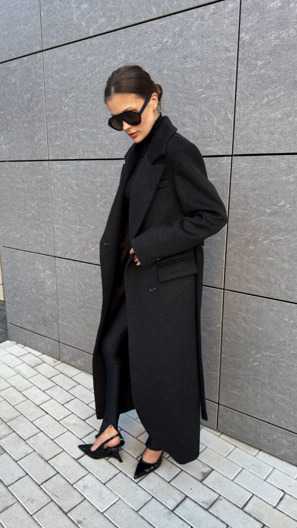Пошите з високоякісної ворсової тканини, яка відрізняється щільністю та зносостійкістю. Матеріал тримає форму, не кошлатиться і має благородну фактуру. Завдяки ворсовому плетінню пальто виглядає глибше за кольором і вигідно відрізняється від класичних варіантів.